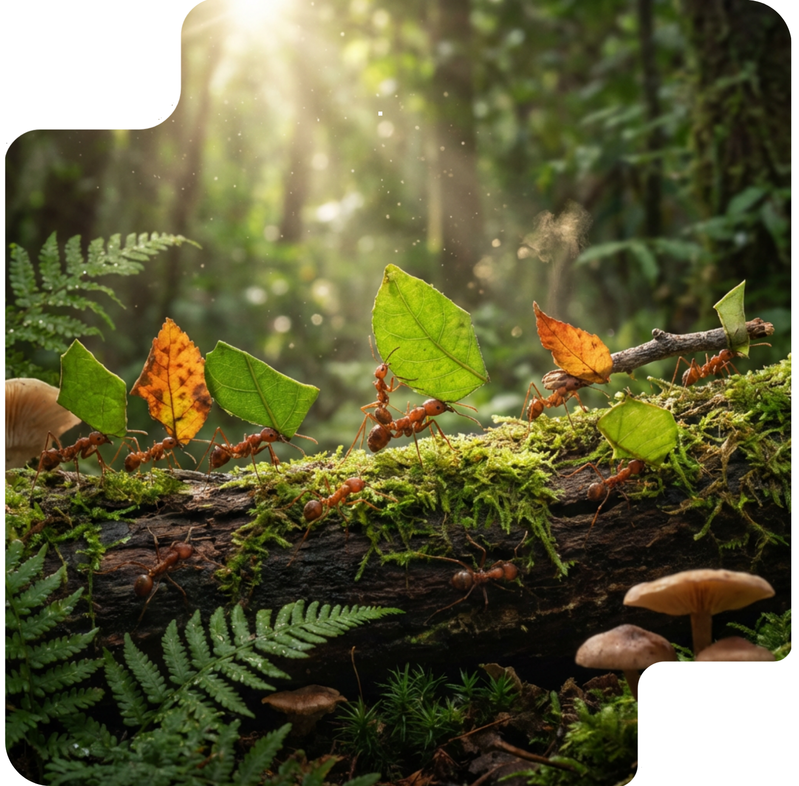 Mravenci nepracují náhodně. Každý z nich následuje neviditelné stopy, které vytváří ostatní. Díky tomu se celá kolonie pohybuje jedním směrem.